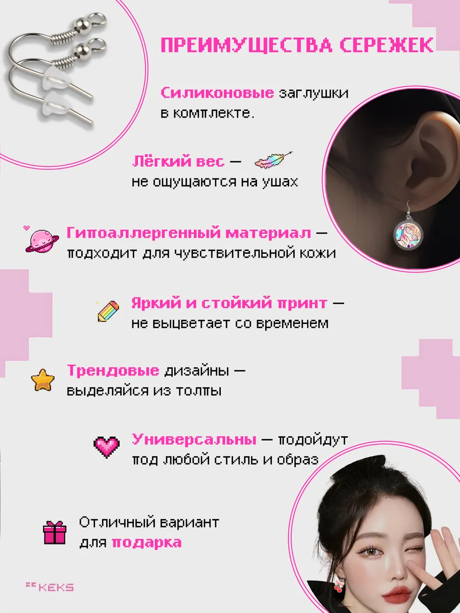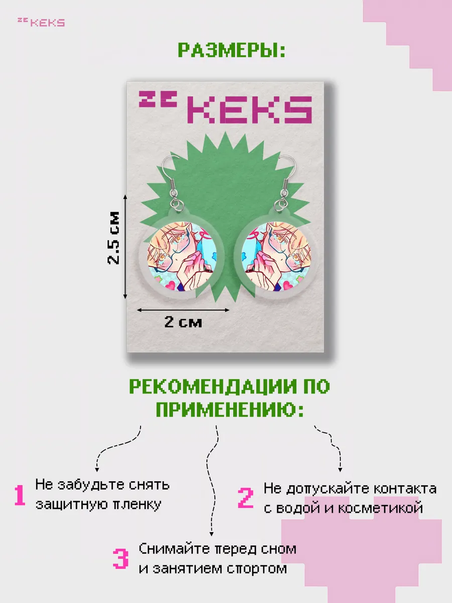 Серьги акриловые в от бренда zeKeks — это не просто украшение, а настоящая находка для тех, кто ищет что-то милое, стильное и эстетичное. Эти легкие сережки выполнены в двустороннем дизайне, они станут ярким акцентом в любом образе. Серьги представлены в разных тематиках таких как аниме, kpop и многие другие, скорее выбирай!
