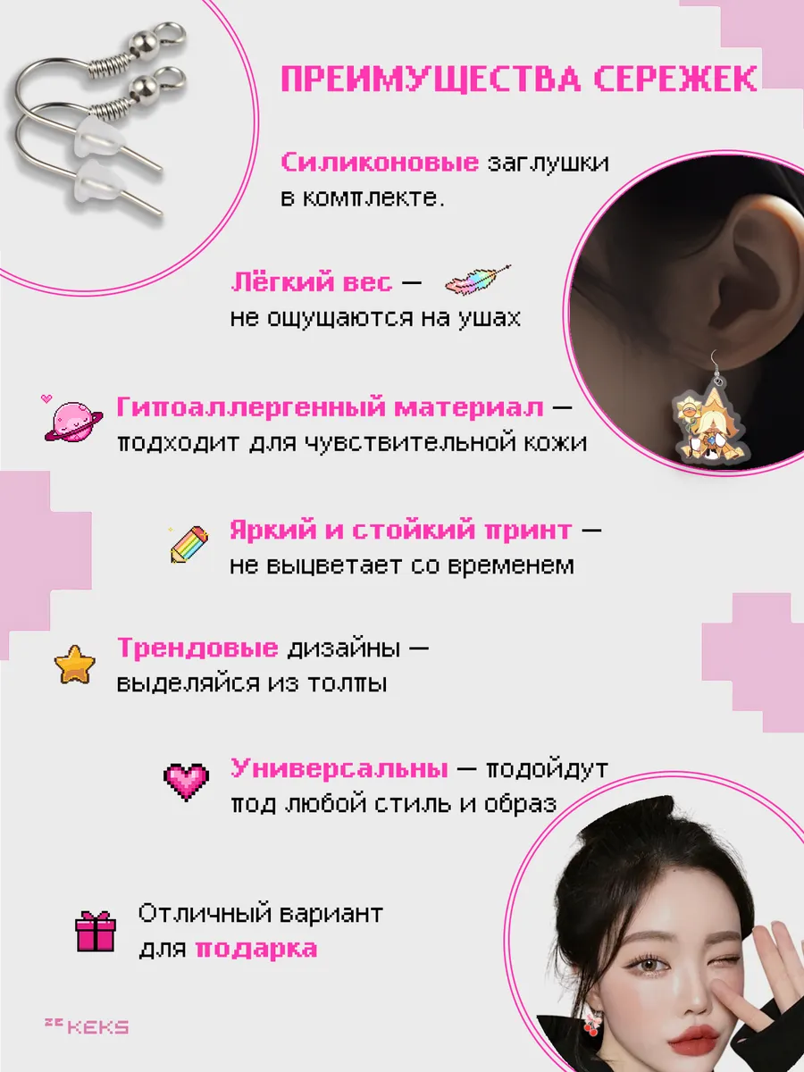 Серьги акриловые в от бренда zeKeks — это не просто украшение, а настоящая находка для тех, кто ищет что-то милое, стильное и эстетичное. Эти легкие сережки выполнены в двустороннем дизайне, они станут ярким акцентом в любом образе. Серьги представлены в разных тематиках таких как аниме, kpop и многие другие, скорее выбирай!