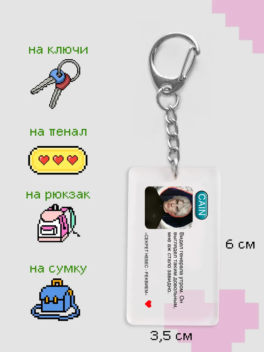 Брелоки из оргстекла по игре Клуб романтики (Romance club) с персонажем Каин (Cain) из новеллы «Секрет небес: Реквием» (Heaven's Secret: Requiem) — это стильный и оригинальный аксессуар, который прекрасно дополнит любой образ. Мы предлагаем широкий ассортимент брелоков с использованием уф печати. Брелоки выполнены из прозрачного акрила, что придаёт им легкость и эстетичный вид. Они идеально подходят для использования на сумке, рюкзаке или ключах и станут отличным акцентом вашего стиля. Также у нас есть возможность создания брелоков с индивидуальными принтами. Не сомневайтесь, что прозрачные брелоки из акрила — это отличный подарок для друзей и близких, который порадует любого фаната аниме или K-pop. Заказывайте уникальные брелоки на нашем сайте и сделайте подарок, который запомнится надолго!