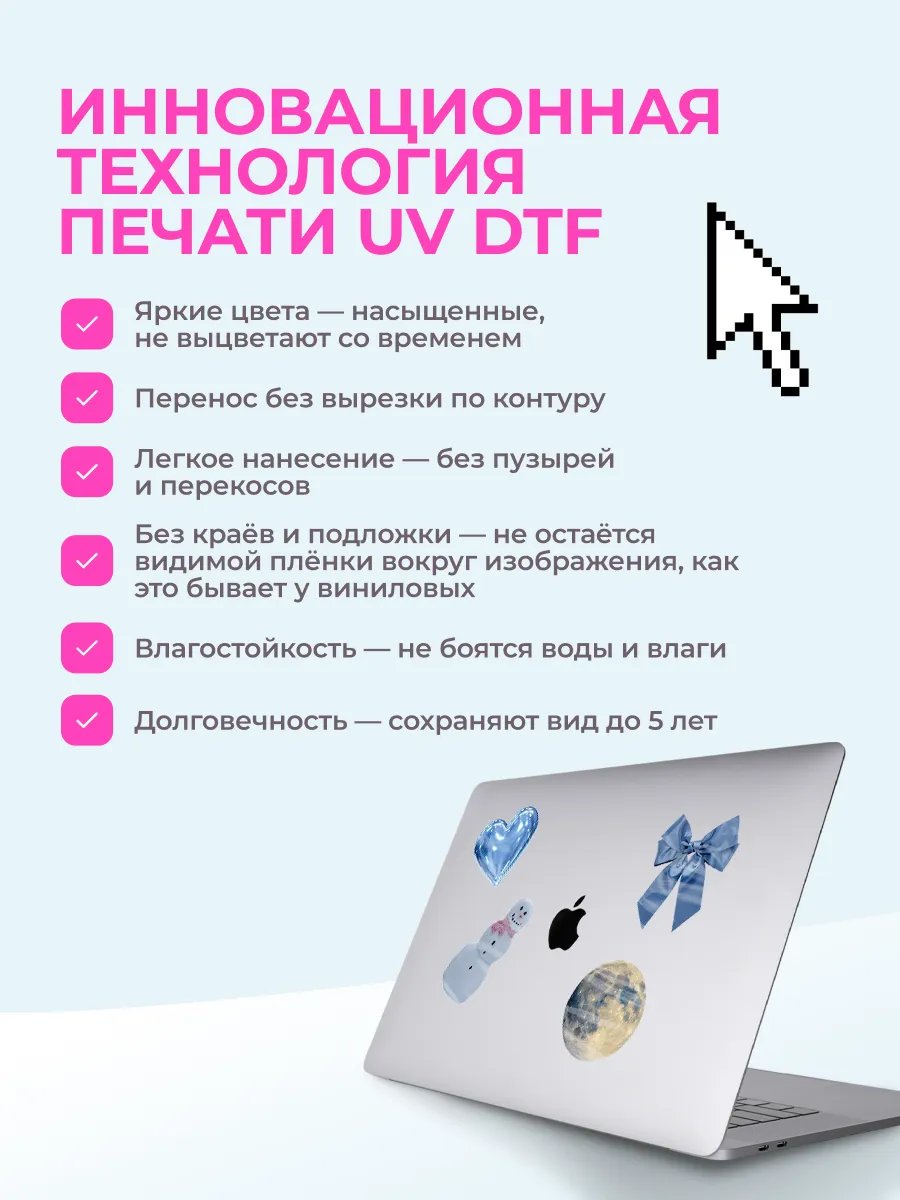 Преобразите свой ноутбук, наушники или чехол для телефона с помощью наших стикеров. УФ ДТФ печать гарантирует насыщенные цвета и четкость изображения, а износостойкое покрытие защитит от царапин и выцветания. Идеально подходят для гладких поверхностей, легко наносятся и снимаются, не оставляя следов. Создайте уникальный стиль и выбирайте из множества дизайнов!