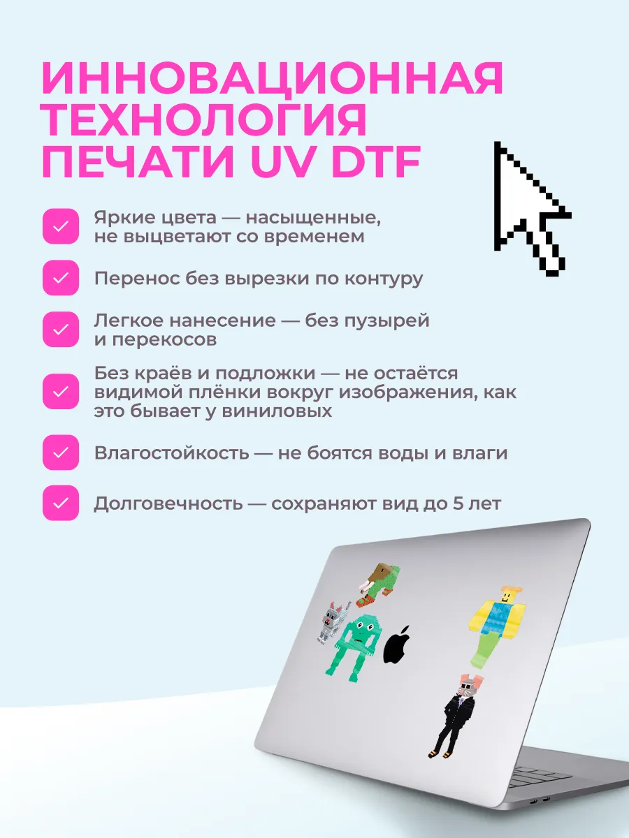 Преобразите свой ноутбук, наушники или чехол для телефона с помощью наших стикеров. УФ ДТФ печать гарантирует насыщенные цвета и четкость изображения, а износостойкое покрытие защитит от царапин и выцветания. Идеально подходят для гладких поверхностей, легко наносятся и снимаются, не оставляя следов. Создайте уникальный стиль и выбирайте из множества дизайнов!