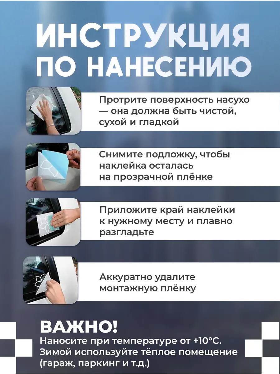 Стикер легко наносится на любую гладкую поверхность — капот, дверь, бампер, боковую панель, зеркало, стекло, багажник. Подходит для любых марок: Toyota, BMW, Kia, ВАЗ 2107, Лада Приора, и многих других. В комплекте — наклейка с нанесённой монтажной плёнкой для удобного переноса и инструкция по установке в карточке товара. Рекомендуется наносить при температуре от +10°C на обезжиренную поверхность.