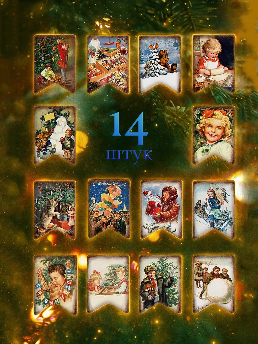 Набор из 14 флажков включает в себя изображение Деда Мороза и Снегурочки, зимние утехи, санки, снеговика, детей и другие рисунки, которые прекрасно дополнят новогоднюю атмосферу. Они выполнены в ретро стиле, что придаст вашей елке неповторимый шарм и создаст атмосферу настоящего советского Нового года.