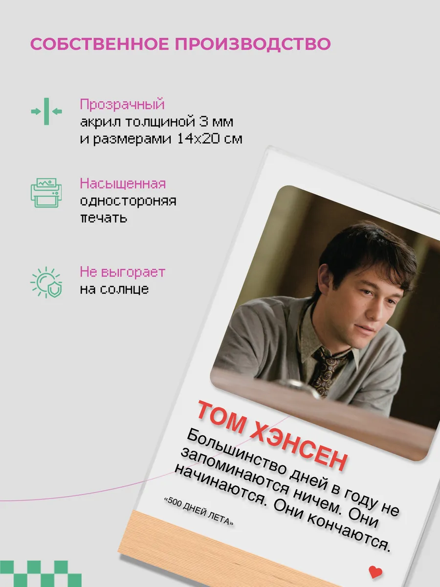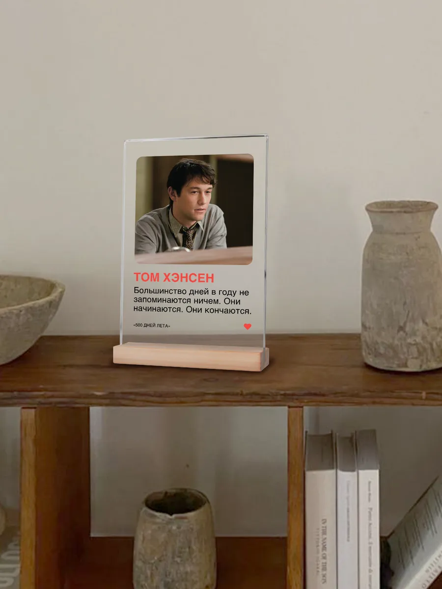 Акриловый постер с цитатой персонажа Том Хэнсен из фильма "500 дней лета" от бренда zeKeks – это уникальное и стильное дополнение к вашему интерьеру, которое не только украсит ваш дом, но и добавит ему атмосферу приключений и экзотики. Изготовленный из высококачественного акрилового оргстекла и дерева, эта подставка предлагает не только визуальное удовольствие, но и функциональность благодаря своей прочной и долговечной конструкции.