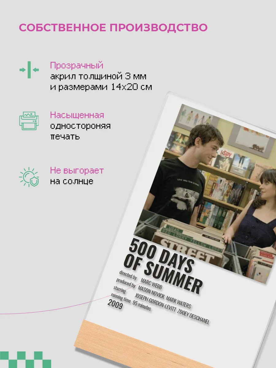 Акриловый постер с информацией о фильме "500 дней лета» (500 Days of Summer, Том Хэнсен, Джозеф Гордон-Левитт, Саммер Финн, Зои Дешанель) от бренда zeKeks – это уникальное и стильное дополнение к вашему интерьеру, которое не только украсит ваш дом, но и добавит ему атмосферу приключений и экзотики. Изготовленный из высококачественного акрилового оргстекла и дерева, эта подставка предлагает не только визуальное удовольствие, но и функциональность благодаря своей прочной и долговечной конструкции.