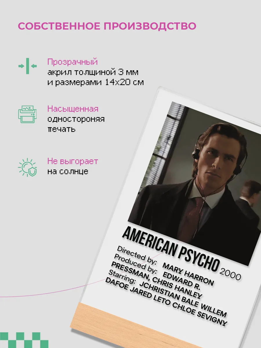 Акриловый постер с информацией об "American Psycho" Патрик Бейтман (Кристиан Бэйл) от бренда zeKeks – это уникальное и стильное дополнение к вашему интерьеру, которое не только украсит ваш дом, но и добавит ему атмосферу приключений и экзотики. Классный и оригинальный подарок или декор на хэллоуин halloween. Изготовленный из высококачественного акрилового оргстекла и дерева, эта подставка предлагает не только визуальное удовольствие, но и функциональность благодаря своей прочной и долговечной конструкции.