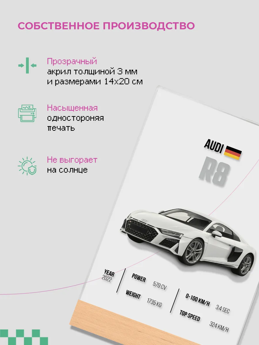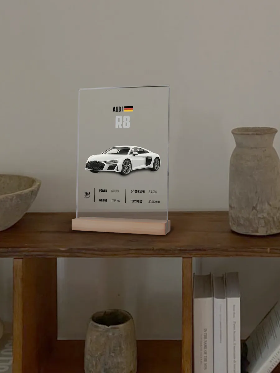 Акриловый постер с автомобилем AUDI R8 (Ауди, Германия, машина, авто) от бренда zeKeks – это уникальное и стильное дополнение к вашему интерьеру, которое не только украсит ваш дом, но и добавит ему атмосферу приключений и экзотики. Изготовленный из высококачественного акрилового оргстекла и дерева, эта подставка предлагает не только визуальное удовольствие, но и функциональность благодаря своей прочной и долговечной конструкции.