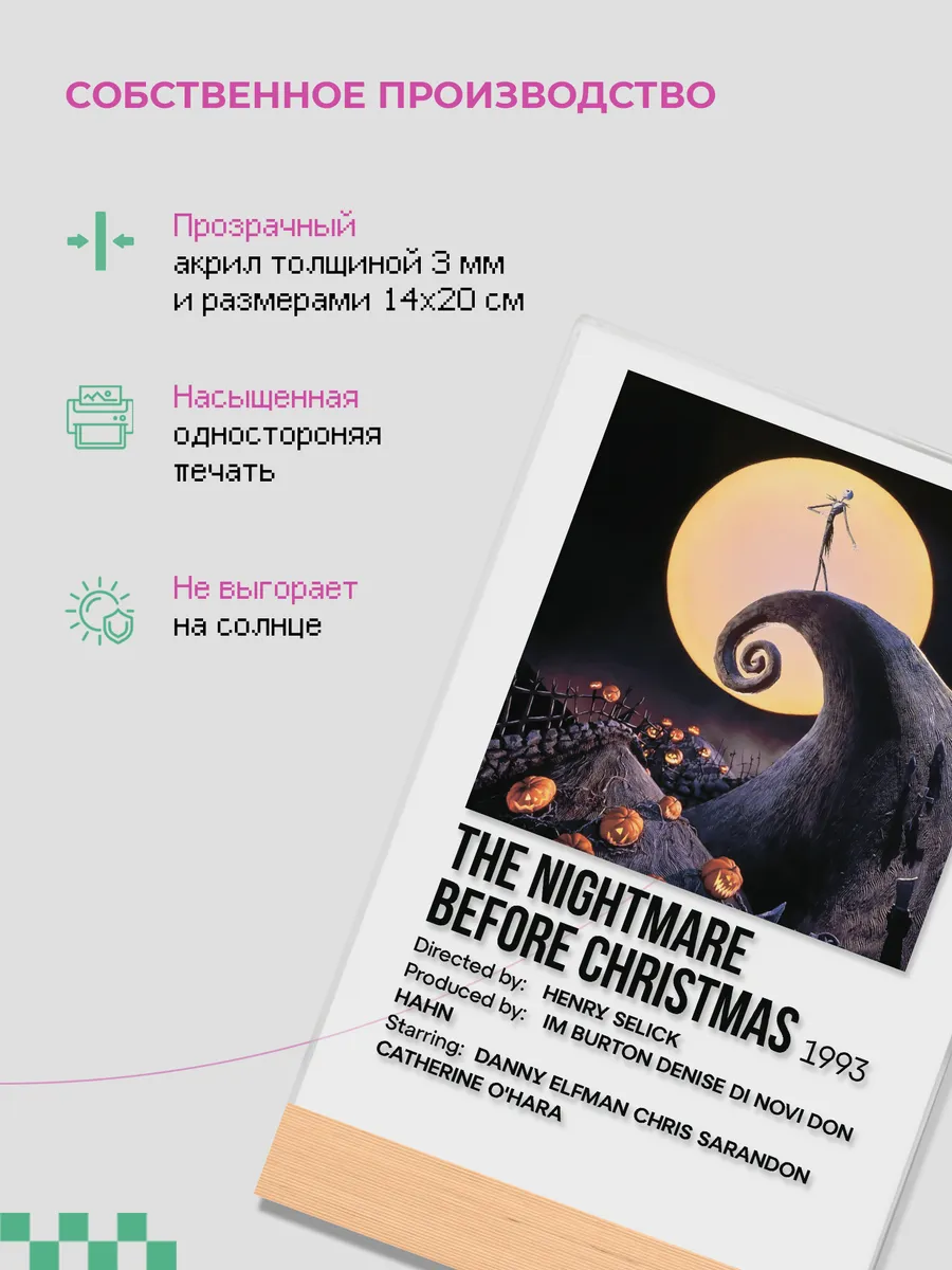 Акриловый постер с информацией об "The Nightmare Before Christmas" от режиссера Тима Бертона от бренда zeKeks – это уникальное и стильное дополнение к вашему интерьеру, которое не только украсит ваш дом, но и добавит ему атмосферу приключений и экзотики. Классный и оригинальный подарок или декор на хэллоуин halloween. Изготовленный из высококачественного акрилового оргстекла и дерева, эта подставка предлагает не только визуальное удовольствие, но и функциональность благодаря своей прочной и долговечной конструкции.