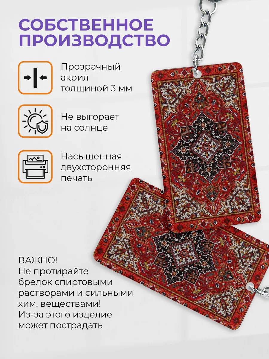 Брелок на ключи "Ковер/ советский ковер/ бабушкин ковер" от zekeks станет стильным и оригинальным аксессуаром – это практичное дополнение для ключей, рюкзака, сумки или ключей автомобиля. Они выполнены из прочного высококачественного материала, который устойчив к внешним воздействиям, включая солнечный свет. Яркий принт сохраняет насыщенные цвета и детали рисунка на долгое время, а лазерная резка обеспечивает точность контуров фигуры и безупречное качество изделия. Наши брелоки с полной заливкой прямоугольные легкие, компактные и удобные в использовании. Они станут отличным выбором для подарка друзьям, близким или самому себе. Это универсальный аксессуар, который подойдет как мужчинам, так и женщинам, подросткам и детям. Брелки могут быть использованы по разному назначению: обвес на сумку, брелок на телефон, на ключи автомобиля, подвеска на рюкзак, стильный аксессуар на пенал. Все наши брелоки мы разрабатываем самостоятельно, поэтому они гармонично дополняют друг друга – вы можете собрать целую коллекцию из любимых тематик. Независимо от того, выбираете ли вы брелок для себя или в подарок на Новый год, День рождения или просто без повода, он обязательно порадует своего обладателя. Добавьте яркий акцент в свой стиль или сделайте запоминающийся подарок с нашими акриловыми брелоками!