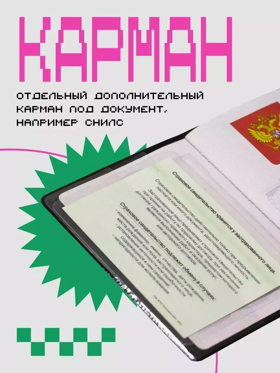 Представляем вам стильную обложку для паспорта из прочного ПВХ с эффектом имитации кожи. Чехол не только защитит ваш документ от повреждений, но и придаст ему элегантный вид за счет яркого и уникального принта. Удобный дополнительный карман для СНИЛС позволит всегда иметь под рукой важные документы. Идеальный аксессуар для путешествий и повседневного использования!