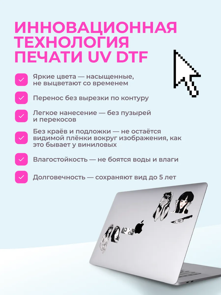 Преобразите свой ноутбук, наушники или чехол для телефона с помощью наших стикеров. УФ ДТФ печать гарантирует насыщенные цвета и четкость изображения, а износостойкое покрытие защитит от царапин и выцветания. Идеально подходят для гладких поверхностей, легко наносятся и снимаются, не оставляя следов. Создайте уникальный стиль и выбирайте из множества дизайнов!